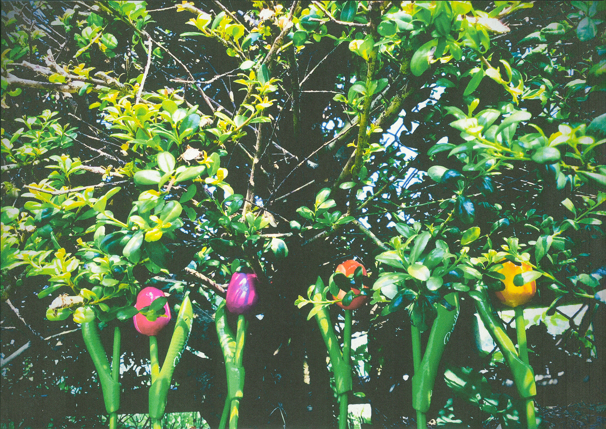 学校校舎周りの無機質な植え込みにあえて光沢のある造花を入れ、家族を表現しました。造花の並びも考えて配置しました。柔らかな雰囲気が出るようにエッジ調整しました。