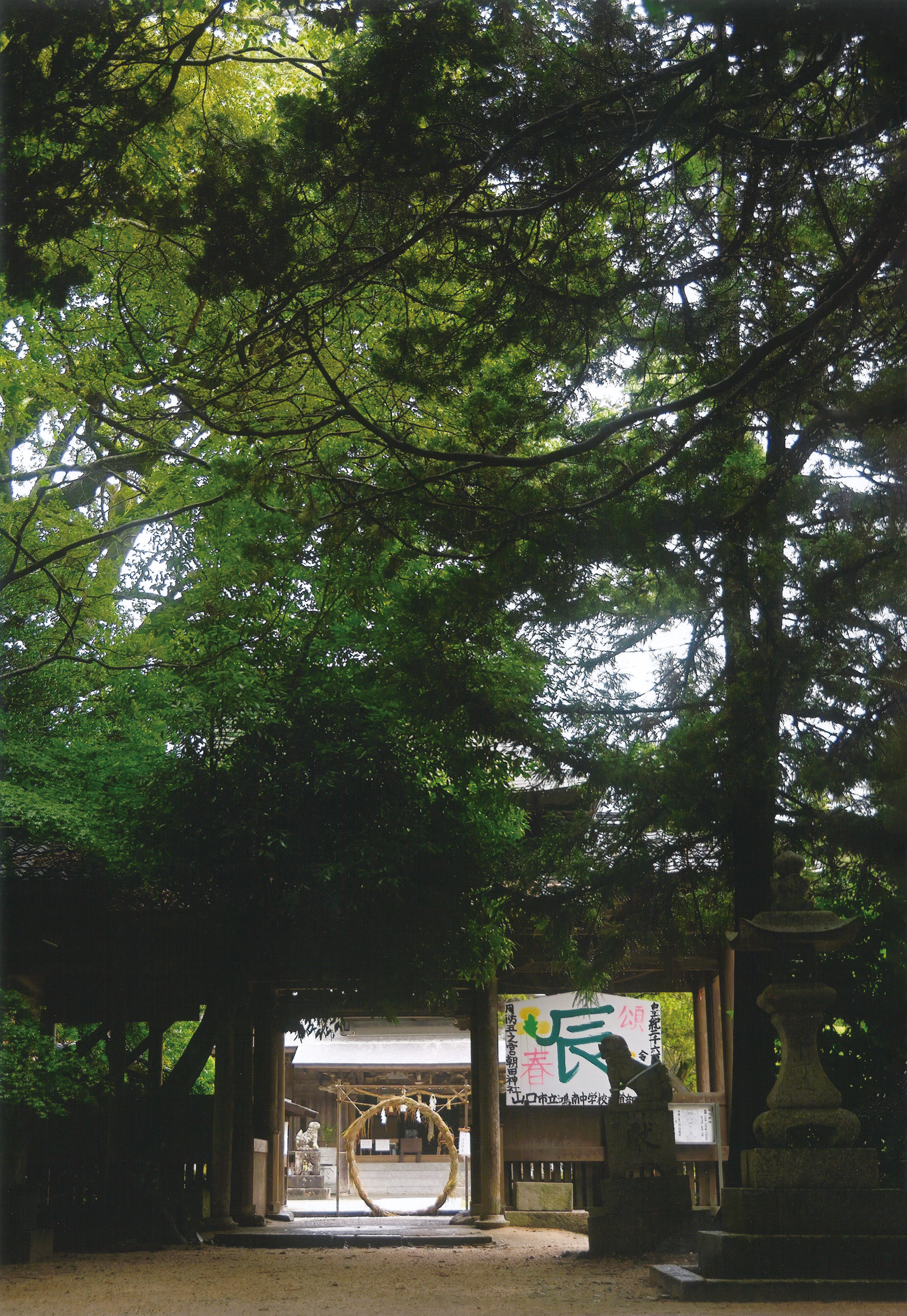 朝田神社 楼門の奥に夏越の祓(なごしのはらえ)の輪が見える。1年の折り返しである6月30日に、茅の輪をくぐって半年間の罪や穢れを祓い、残り半年の無病息災を祈願する神事。