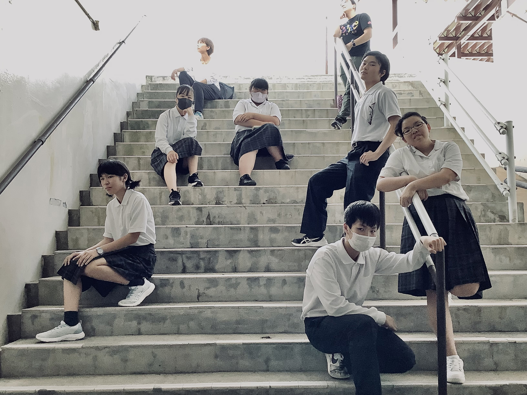 地下道の暗がりを利用しました。下の人たちはカメラ目線で、上の人たちはあえて目線をはずしました。真顔にしたり、かっこつけたり、人の位置にこだわりました。みんなで楽しくとりました。賞がもらえてよかったです。