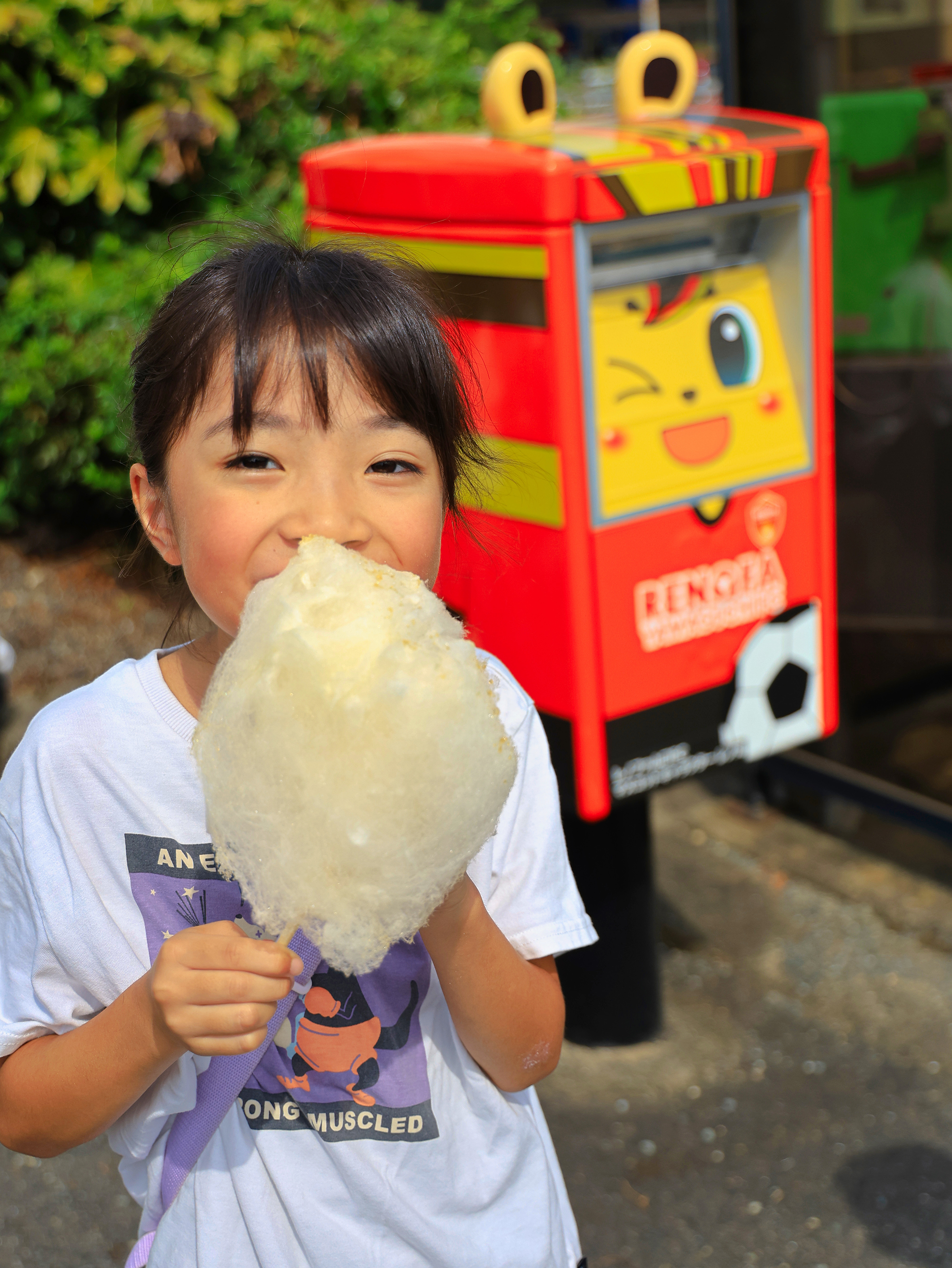 綿菓子を美味しそうに食べている様子を、ポストのキャラクターがまるで「いいね!」と言っているようだった。